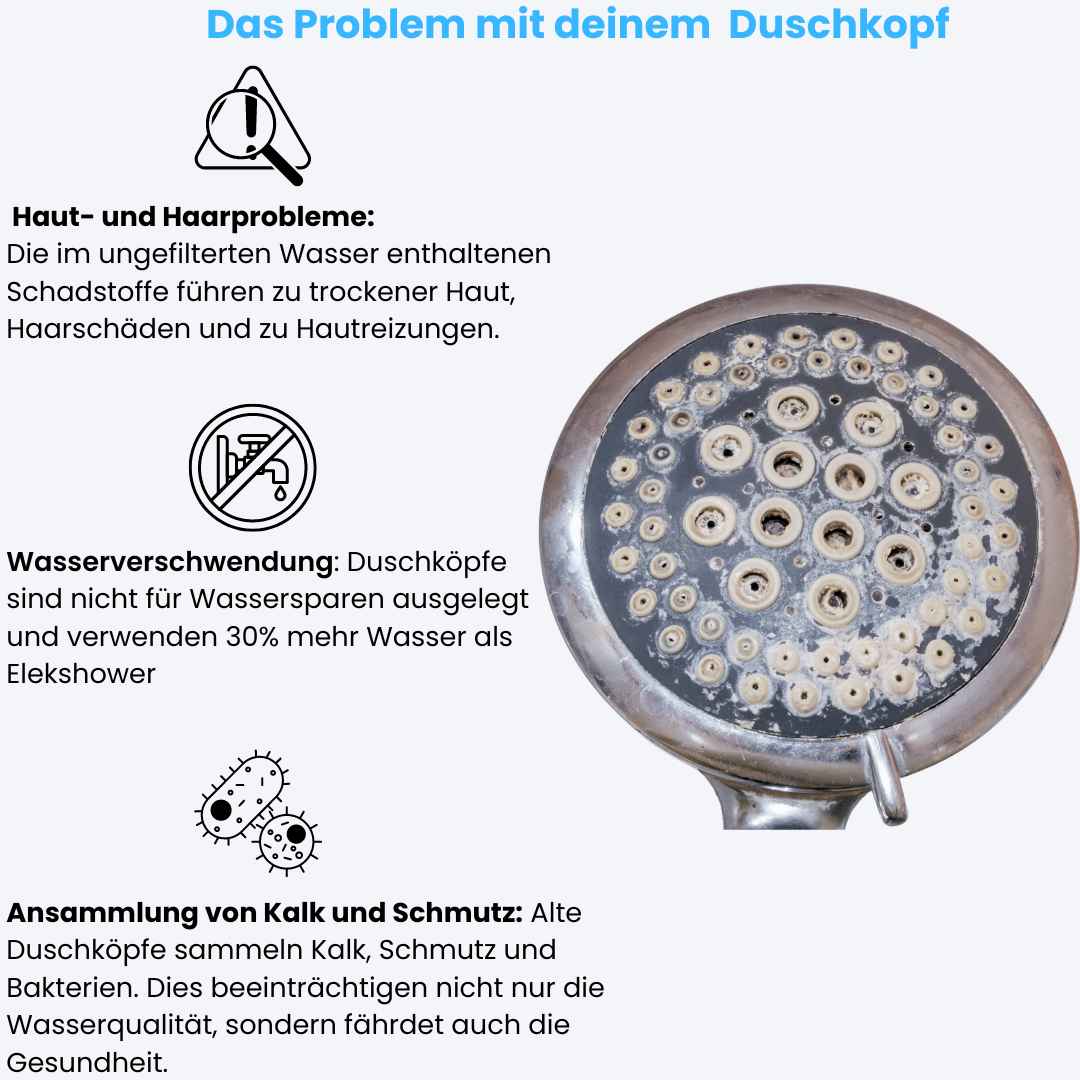Er pumpt Unmengen an Chlor, Schwermetallen und Bakterien direkt auf deine Haut und in dein Haar, was nicht nur zu Trockenheit und Reizungen führt, sondern auch ernsthafte Gesundheitsrisiken birgt. Außerdem sind viele alte Modelle wahre Wasser- und Energieverschwender – schlecht für die Umwelt und deinen Geldbeutel. Es ist Zeit, deiner Haut, deinem Haar und unserem Planeten etwas Gutes zu tun. Sag "Nein" zu alten, ineffizienten Duschköpfen und mach den Schritt hin zu einer gesünderen, luxuriöseren und umweltfreundlicheren Duscherfahrung.