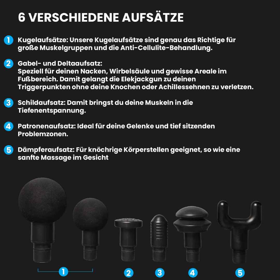 Unsere Massagepistole ist ein vielseitiges Werkzeug zur Entspannung und Regeneration deiner Muskeln. Mit dieser Massagepistole kannst du sie gezielt an Rücken, Schultern, Nacken, Armen und Beinen verwenden. Egal ob du Verspannungen im Rückenbereich lösen, deine Schultern lockern, Nackenverspannungen bekämpfen oder deine Arme und Beine entspannen möchtest - diese Massagepistole bietet dir die Möglichkeit, gezielt auf die verschiedenen Körperpartien einzugehen.
