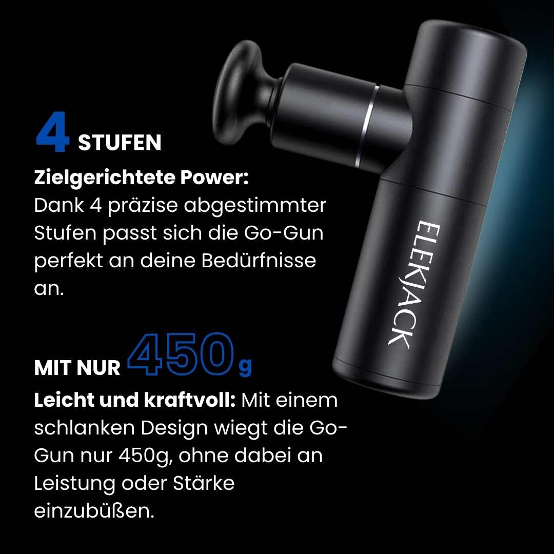Mit 4 individuell abgestimmten Stufen passt sich die Go-Gun deinen Bedürfnissen an und sorgt für eine gezielte und wohltuende Massage – ideal zur Linderung von Rücken- und Nackenschmerzen. Trotz des leichten Designs von nur 450g bietet die Go-Gun kraftvolle Leistung für maximalen Komfort, ohne deine Entspannung zu beeinträchtigen.