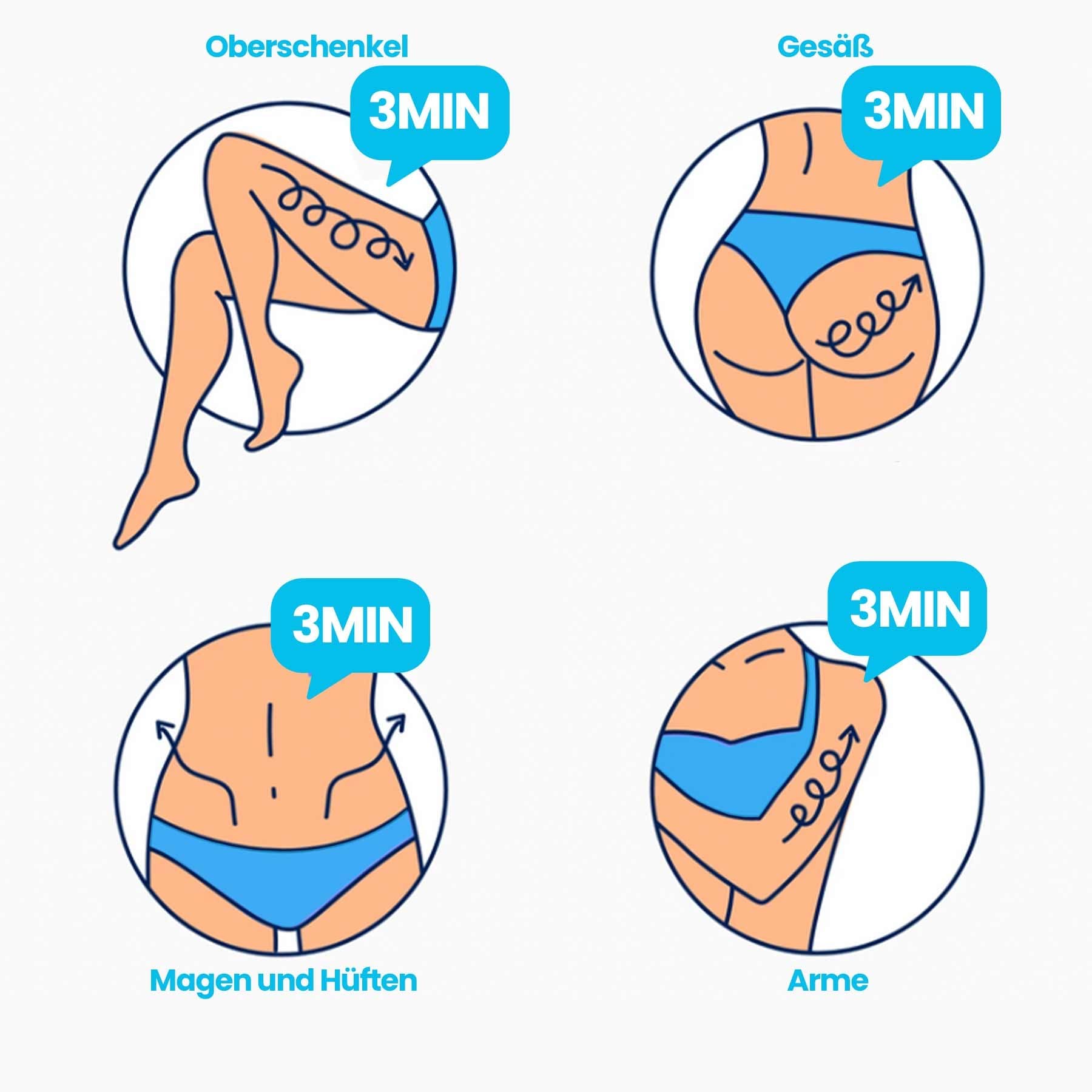 - Anwendungsbereiche: Oberschenkel, Po, Bauch