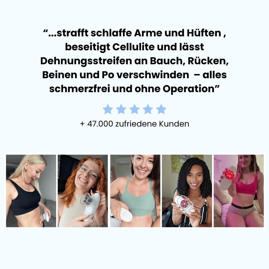 Die Kombination aus Vakuum, EMS und Rotlicht erreicht tiefere Hautschichten, die Cremes oder Massagen allein nicht erreichen können. Dadurch werden:
