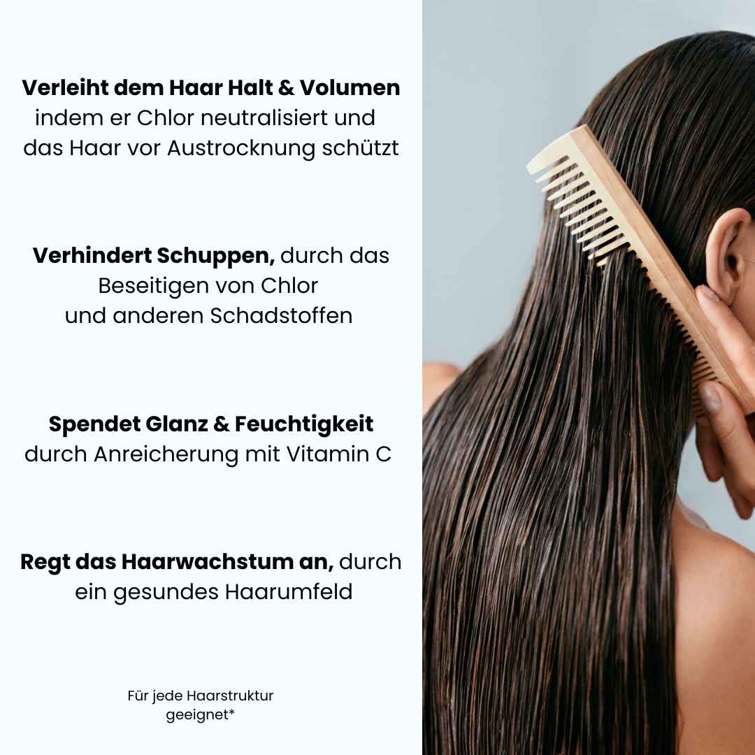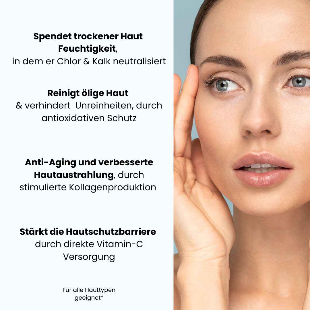 Er eliminiert Chlor und Schadstoffe, die Irritationen und Trockenheit verursachen, und schenkt dir sofort eine spürbar weichere, hydratisierte Haut. Vitamin C bekämpft freie Radikale, fördert die Kollagenproduktion und schützt vor UV-Schäden, um deine Haut jugendlich strahlen zu lassen. Genieße den Unterschied schon nach der ersten Anwendung und lass deine Haut Tag für Tag jünger aussehen und sich auch so anfühlen.